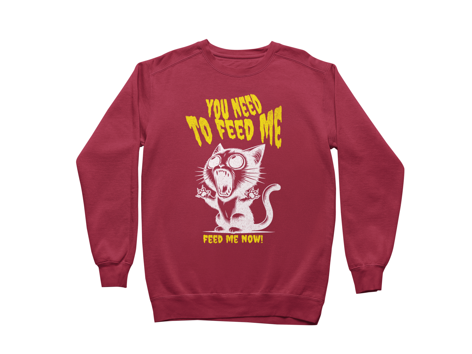 If your cat could talk, this is exactly what they'd scream—probably five minutes after they already ate. The "You Need to Feed Me" sweatshirt features an overdramatic, bug-eyed feline in full meltdown mode, captured in bold black-and-white linework with retro horror-style type. It's the ultimate tribute to your food-obsessed feline overlord.
