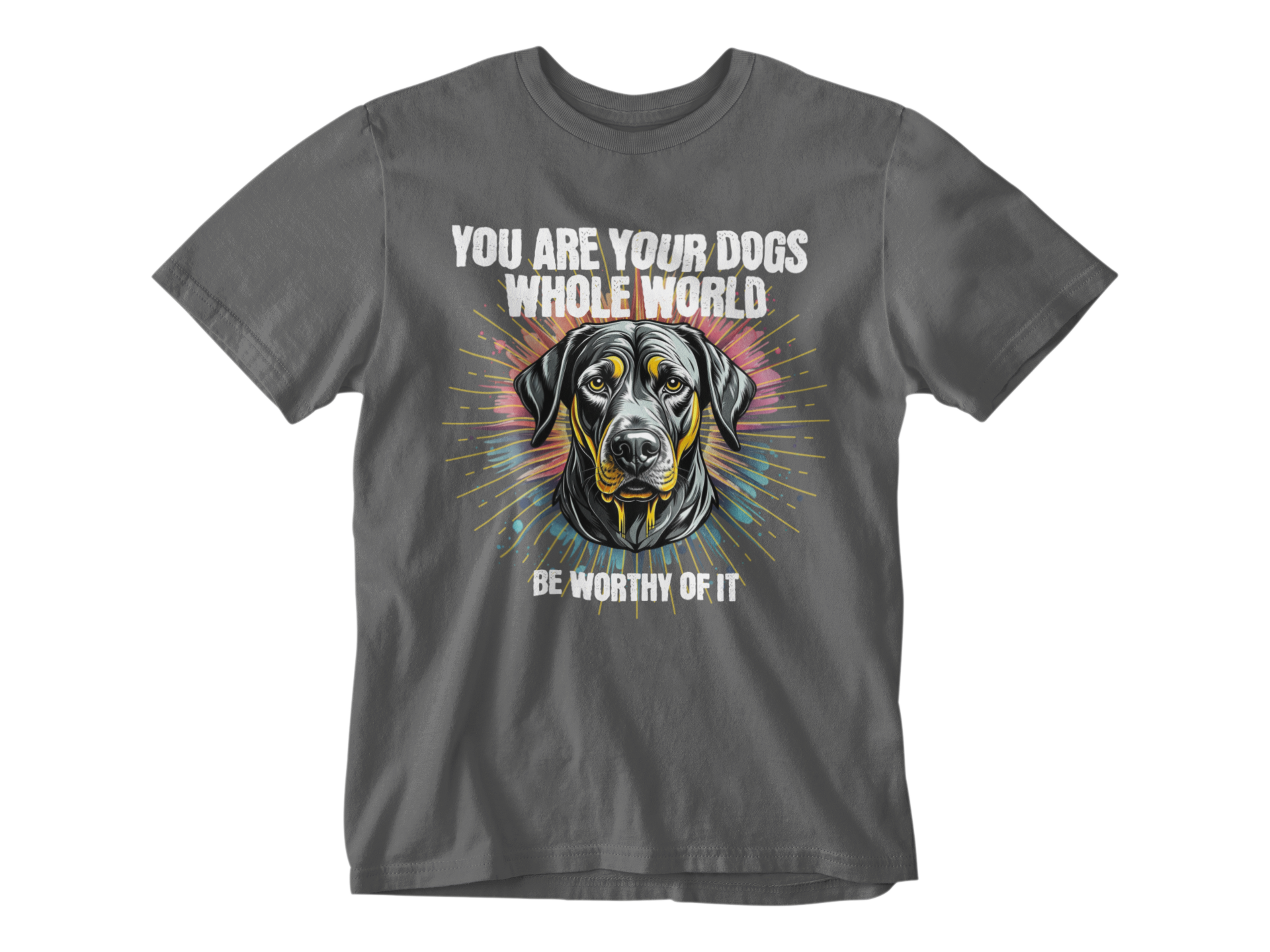 This tee is a powerful reminder of that unconditional love and devotion. Featuring a striking hand-drawn dog portrait and the heartfelt message “You Are Your Dog’s Whole World – Be Worthy of It,” this shirt is perfect for those who cherish their bond with their furry best friend.